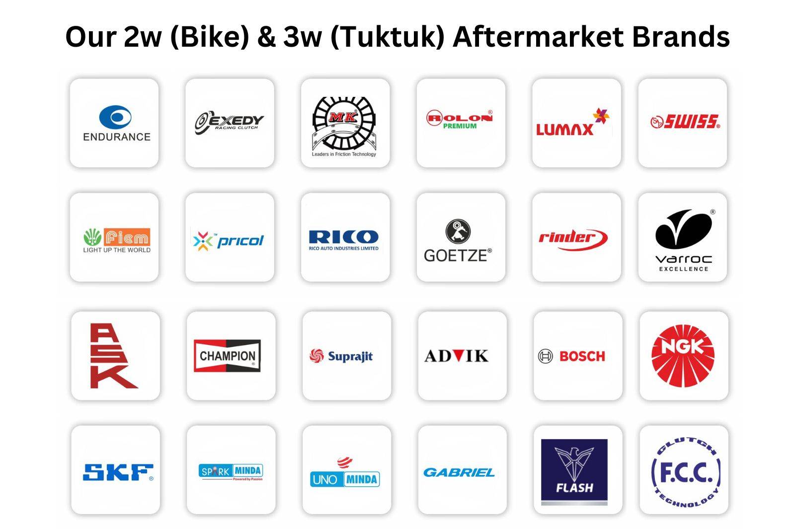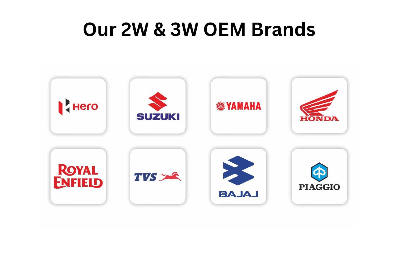 Primero, ofrecemos una amplia gama de marcas originales (OEM) como Bajaj, Hero, TVS, Honda, Yamaha, entre otras,